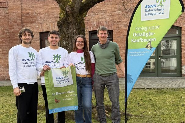 Von Montag,den 9. März, bis voraussichtlich einschließlich Samstag, 28. März wird ein Team von 3 jungen Leuten (v. li. nach re. Daniel Kartaschow, Johannes Stempel, Sophie Schreiner und Flächenmanager Harald Jungbold) im südlichen Landkreis Ostallgäu an der Haustür über den Bund Naturschutz und seine Projekte informieren.