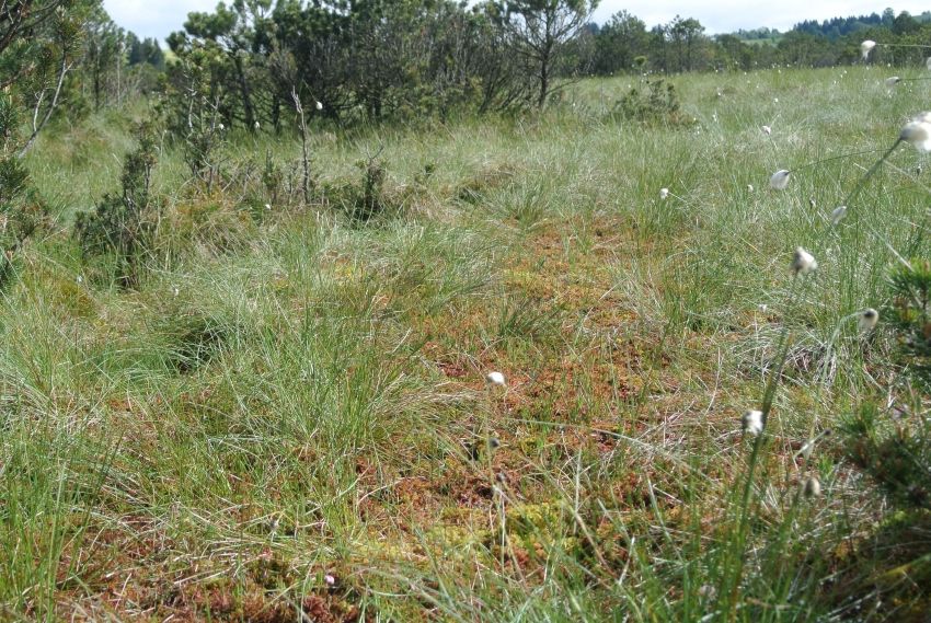 Nebelschleiern. Im Hochmoor wachsen Torfmoose, Wollgras und Moorkiefer.