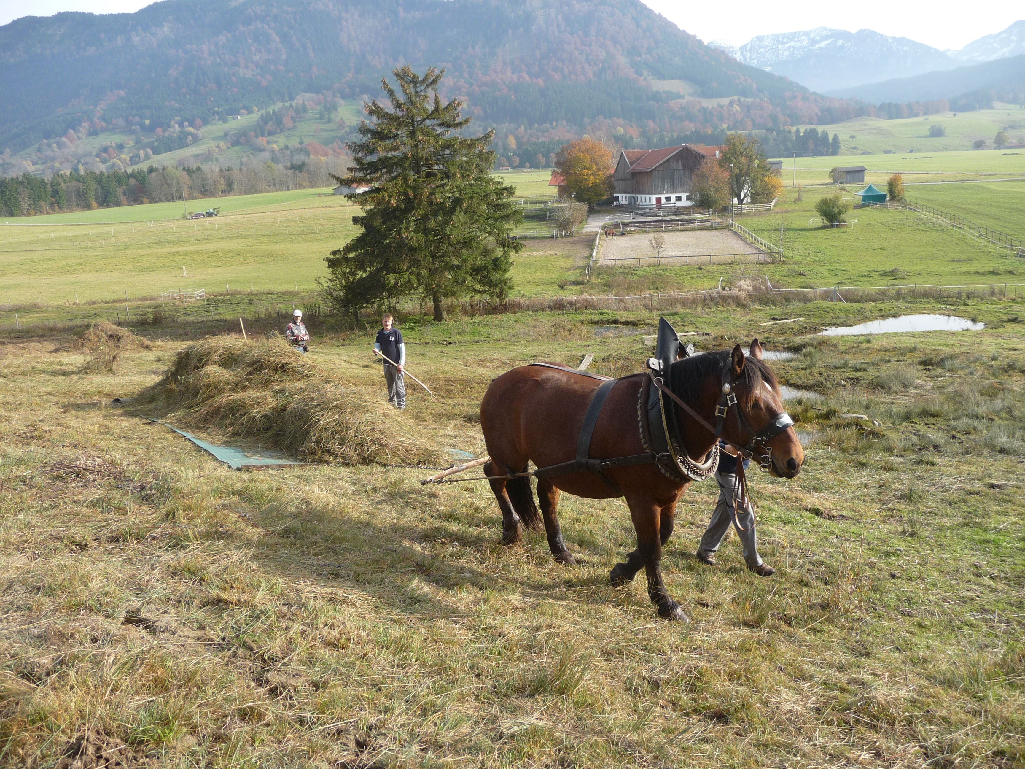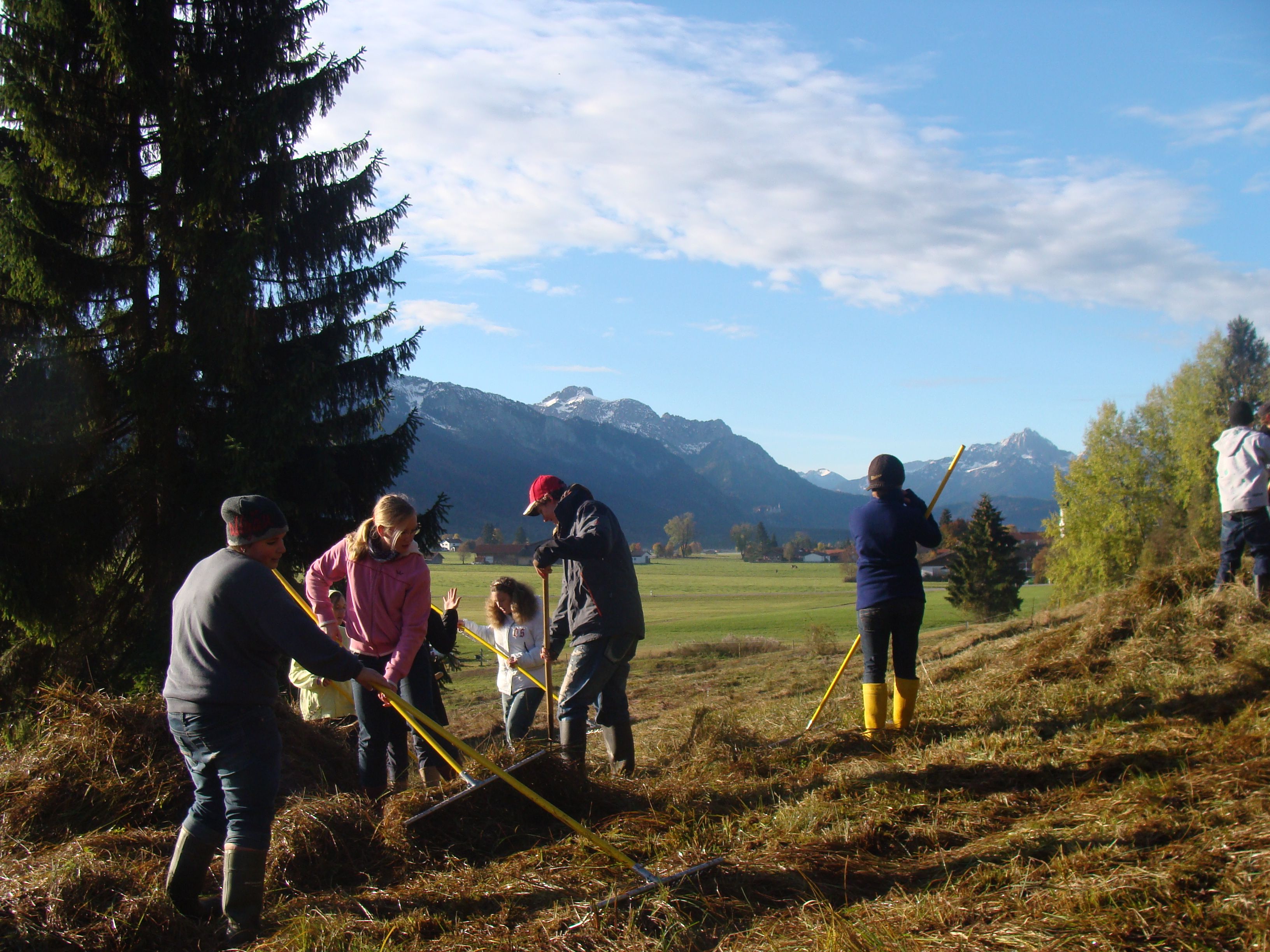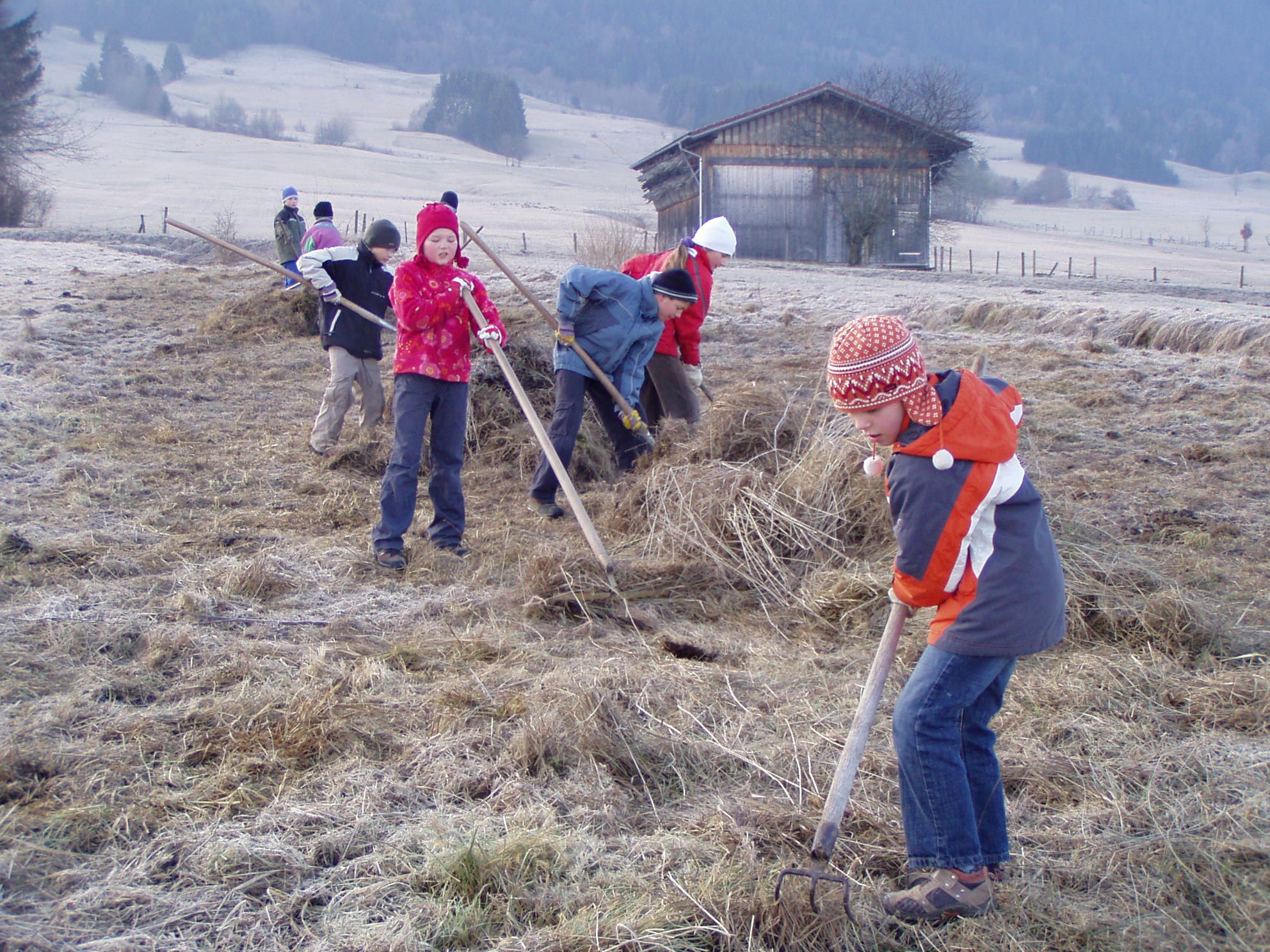Die Volksschule Trauchgau betreut ein Feucht-Biotop. Die Mäharbeiten wurden vom BN organisiert und durchgeführt. Viel Begeisterung und Fleiß zeigten die Schüler dann beim Zusammenrechen des Mähgutes.