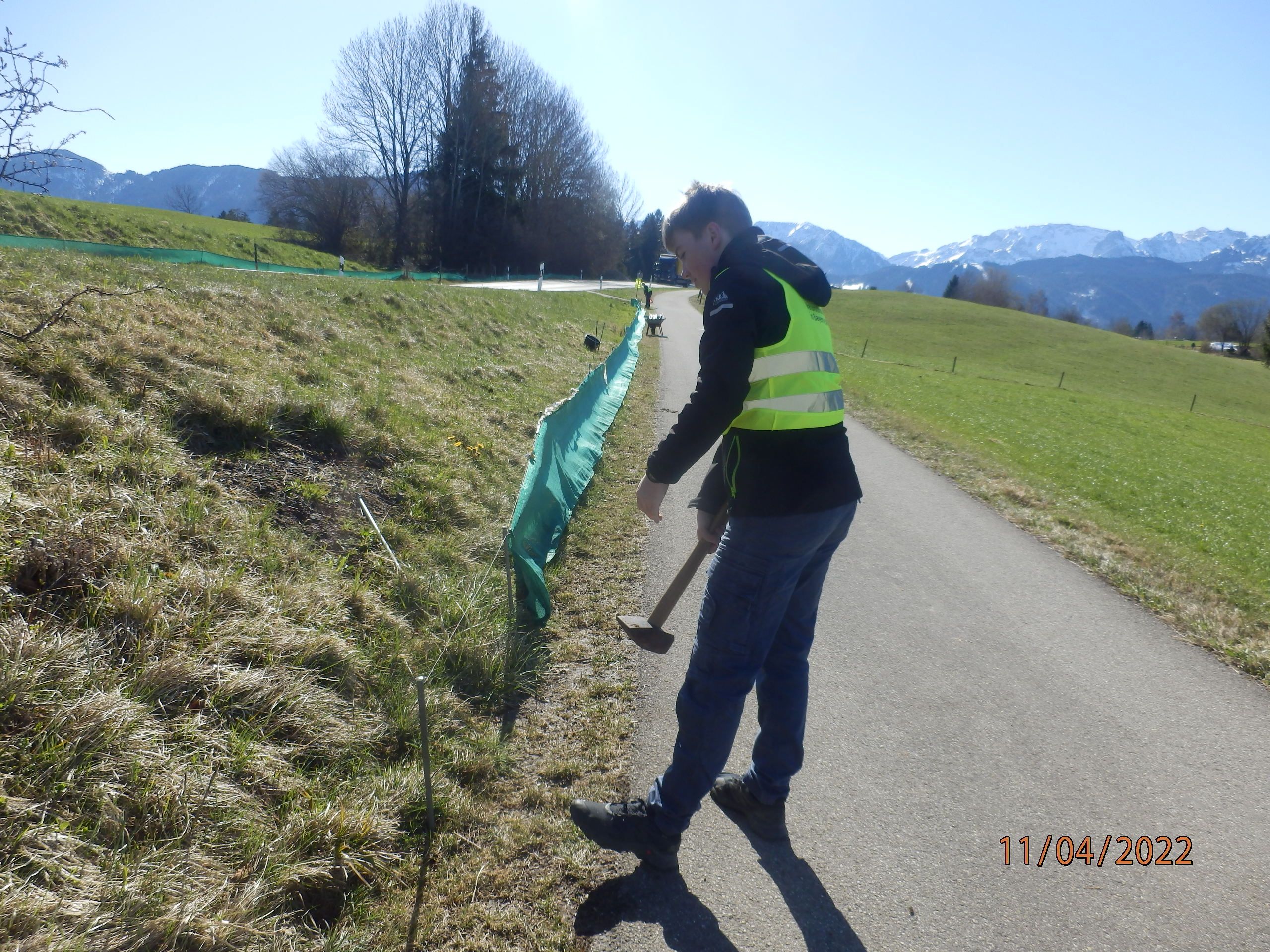 Auch hier in unserer Gemeinde am Schapfensee. Denn die Kröten wandern zuerst von ihren Winterquartieren, zum Schapfensee um dort ab zu laichen. Danach kehren die Amphibien wieder zu ihren trockenen Quartieren zurück. Und jedesmal müssen die Kröten die Kreisstraße überqueren. Um zu verhindern, dass sie hier überfahren werden, stellt die Ortsgruppe, Halblech - BUND- Naturschutz einen „Amphibienschutzzaun“ auf. Entlang des Zaunes sind einige Kübel vergraben, in die die Kröten dann fallen. Um zu vermeiden, dass die Kröten allzulange in den Kübeln festsitzen, gehen die Helfer am späten Abend und in am frühen Morgen den Zaun ab und tragen die Kröten über die Kreisstrasse. Dabei mußten die Helfer leider feststellen, dass die Zahl der Kröten in den letzten 6 Jahren immer mehr abnimmt und die Zahl der Frösche fast schon bei Null angekommen ist. Dennoch hoffen wir alle, daß die Arbeit der Ortsgruppe bald Früchte trägt und ein weiteres Artensterben hier am Schapfensee verhindert werden kann.