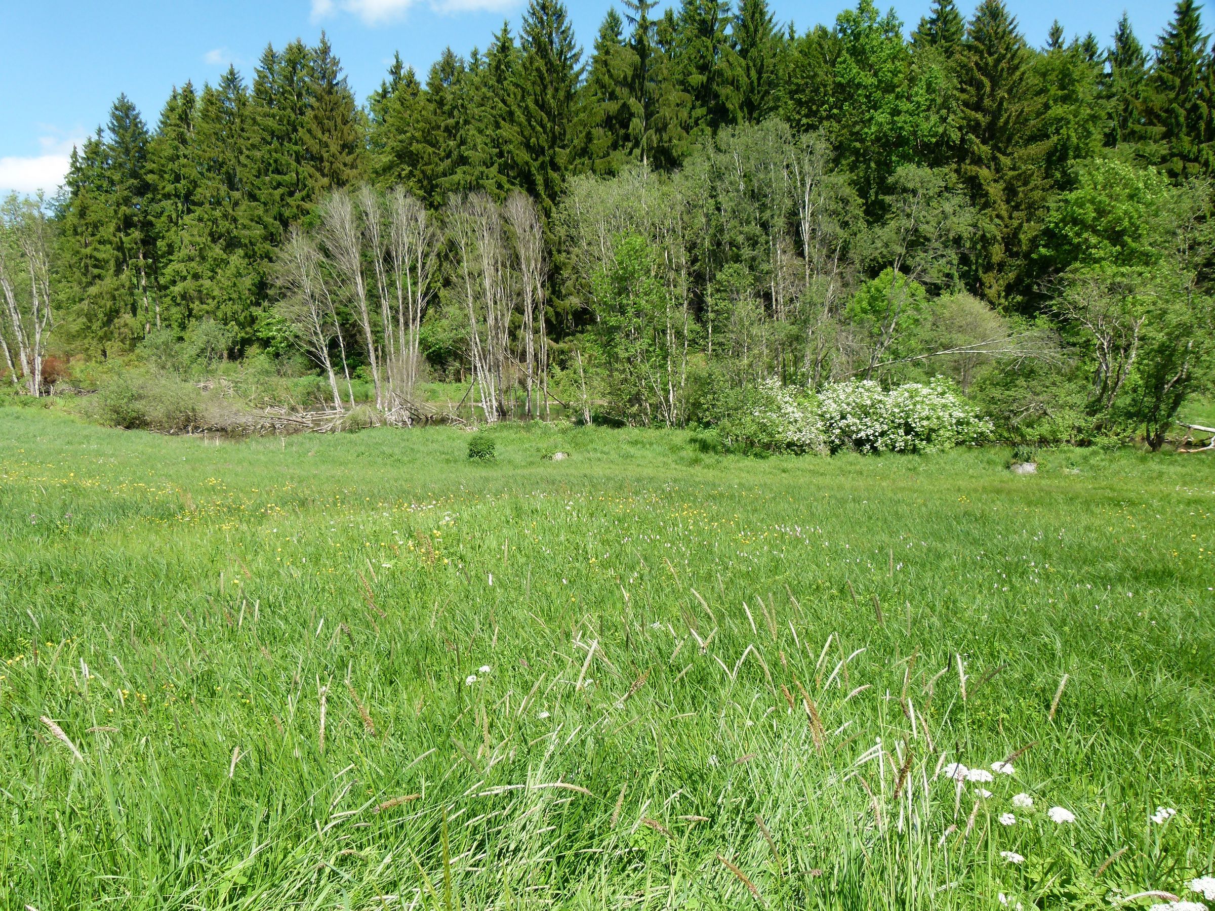 Die Wiesenfläche wird auf einer Seite vom „Irseer Bach“ gesäumt, Hier ging in den letzten Jahren ein Biber eifrig ans Werk, so dass inzwischen einige Dämme und weite Mäandrierungsstellen den Bach verändert haben.