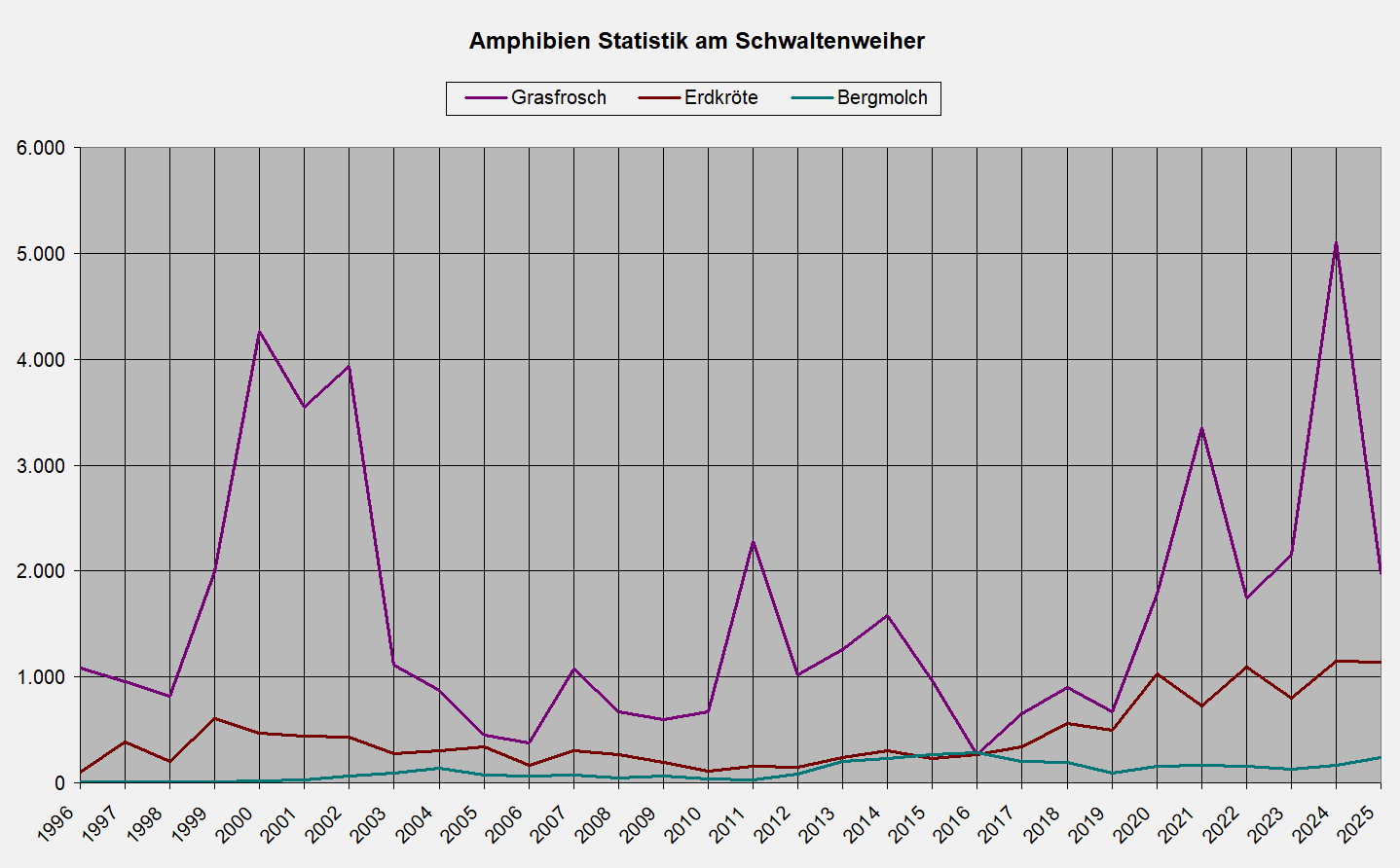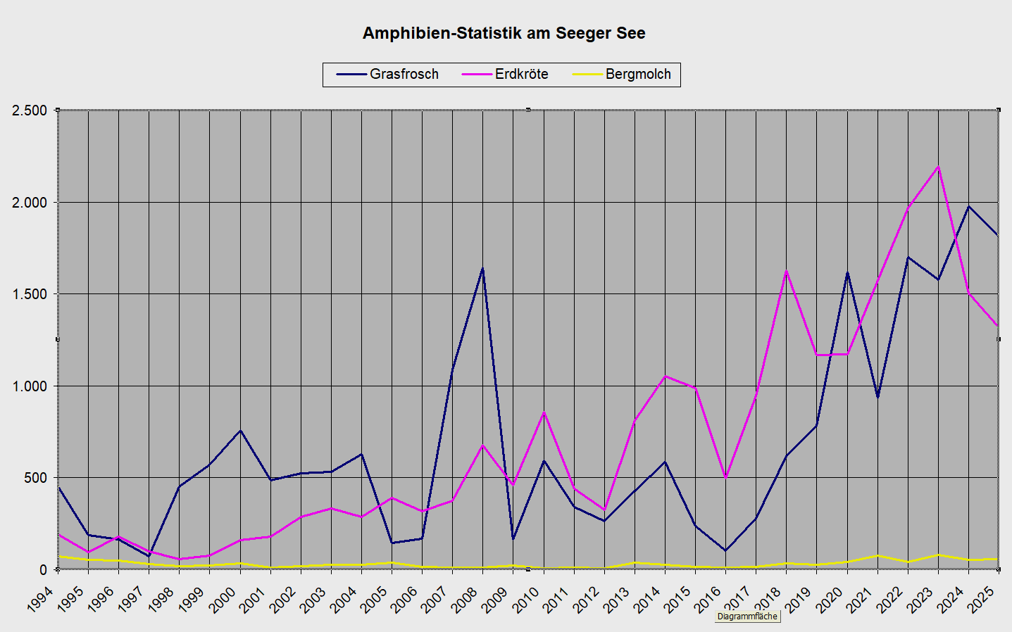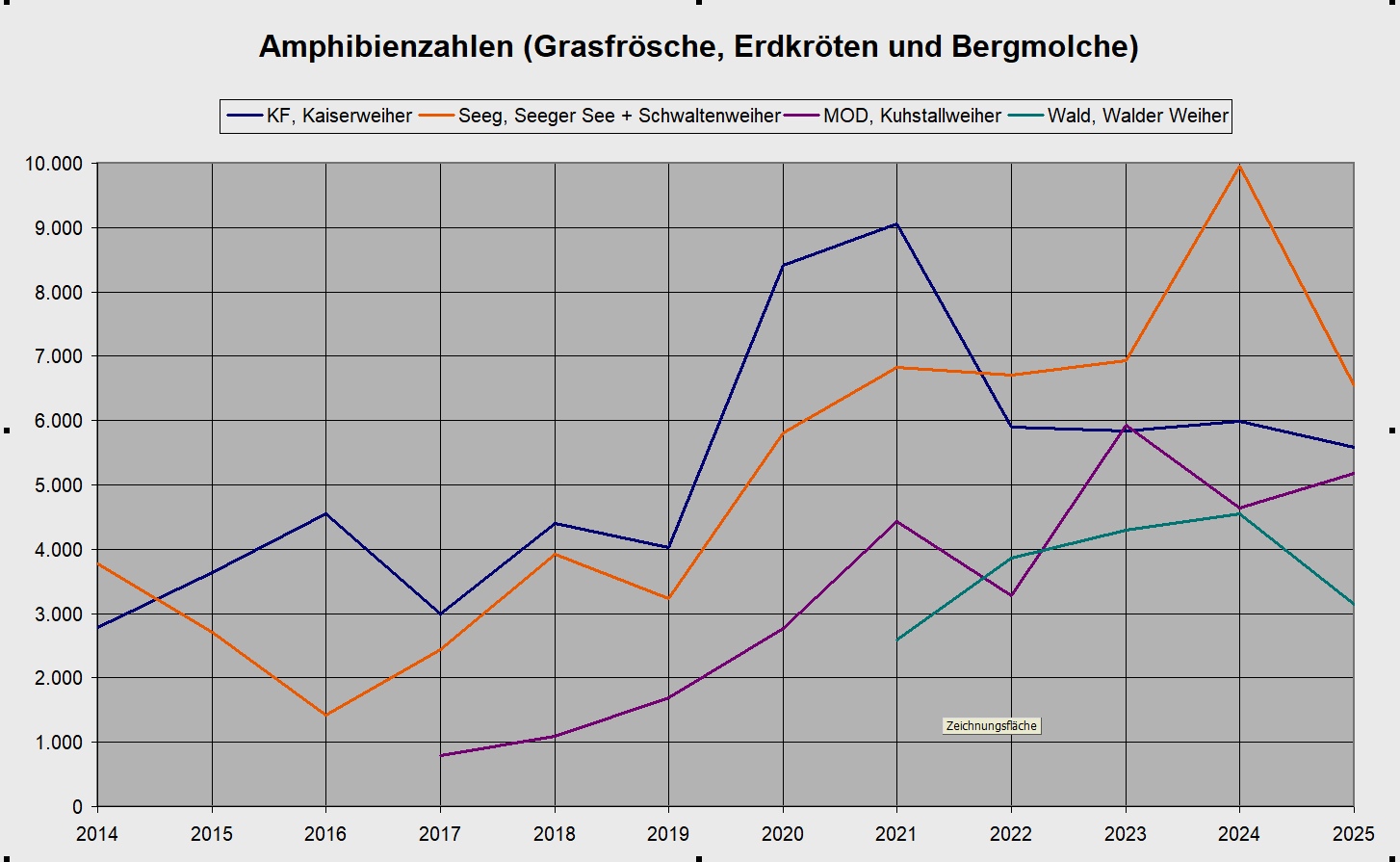 Die Amphibienzahlen sowohl am Seeger See als auch am Schwaltenweiher bleiben auf hohem Niveau, wie die Graphiken der Jahre 1994 bzw.1996 bis 2025 verdeutlichen.