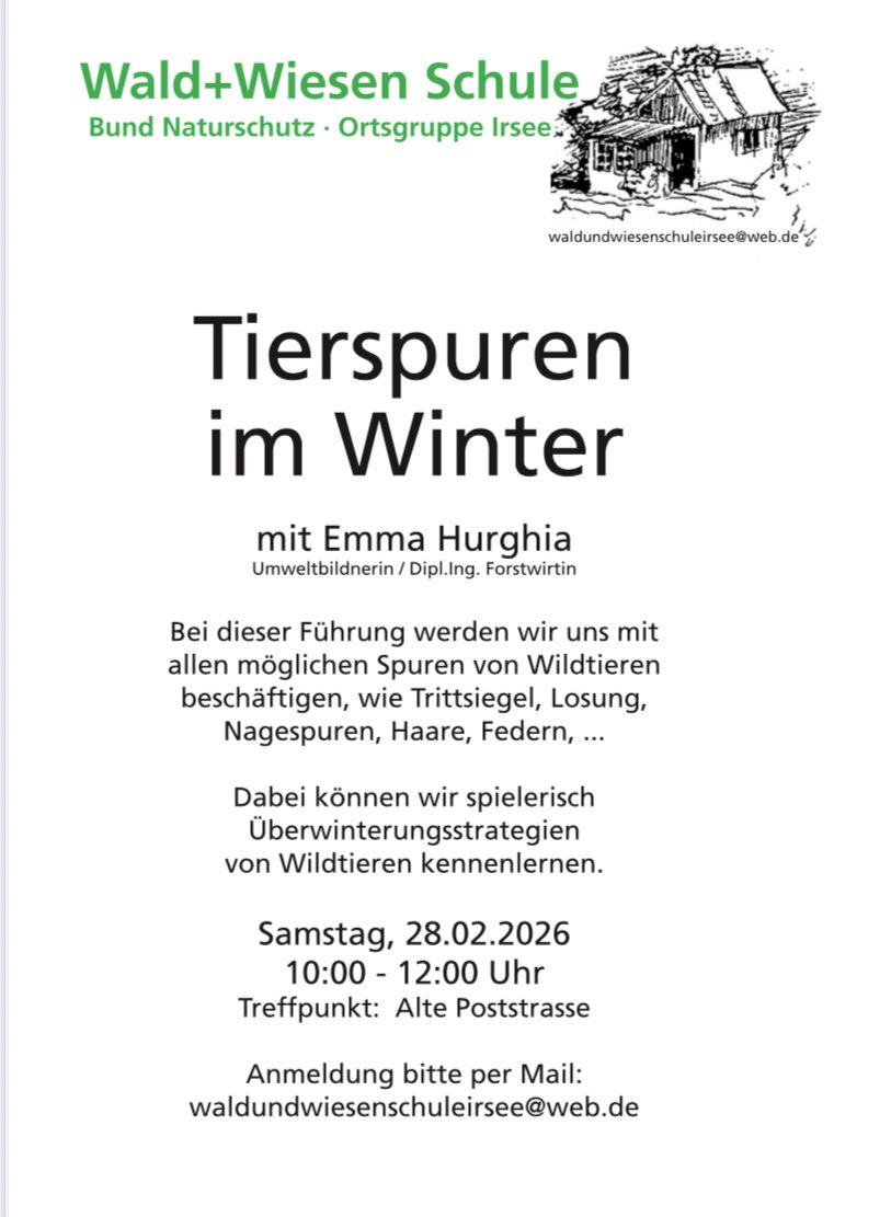 Die Jägerin und Dipl. Ing. Forstwirtin Emma Hurghia, geht erneut mit euch auf Spurensuche. „Tierspuren im Winter“ findet am Samstag den 28.2.2026 um 10 bis 12 Uhr statt. Treffpunkt sind wieder die Bäume/ Alte Poststrasse. Parken, bitte auf dem Meinrad-Spießplatz oder ggf. auf dem Parkplatz der Schule. Bitte anmelden per Mail. Unter: Waldundwiesenschuleirsee@web.de